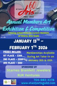 This is a chance for our members to show off their amazing artistic talents. To enter this show you must be a member of the Stanly Arts Guild. (Yes, memberships are accepted during art take-in for the show!) Awarded prizes are 1st, 2nd & 3rd place, with honorable mention ribbons being handed out at the judge’s discretion. Our next Member’s Show will be January 13th thru February 7th, 2026. Art take-in will be January 9th  & January 10th, 2026. All entries must not have previously won a ribbon in a Stanly Arts Guild show.  Show information can be found by clicking the button in our “annual show” section and membership applications can be found under the “join” tab. Or, you can always stop by for a visit as The Guild Store and pick up a copy.
