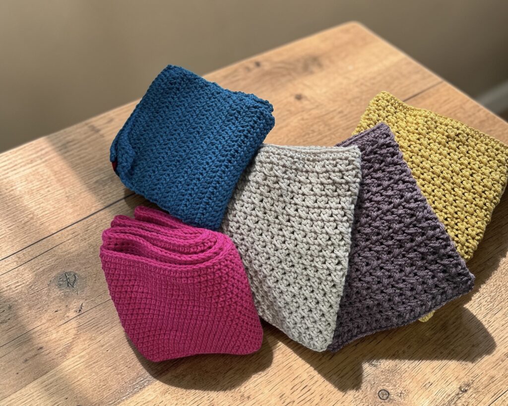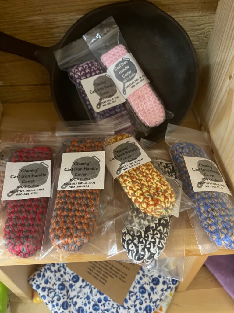 The name say it all–I have a little of this and some of that. These things include: crocheted dish clothes, washcloths, pot scrubbers, scarves and beanies. I also make 3 sizes of rice bags with removable and washable covers, microwave potato bags and crocheted cast iron handle covers.