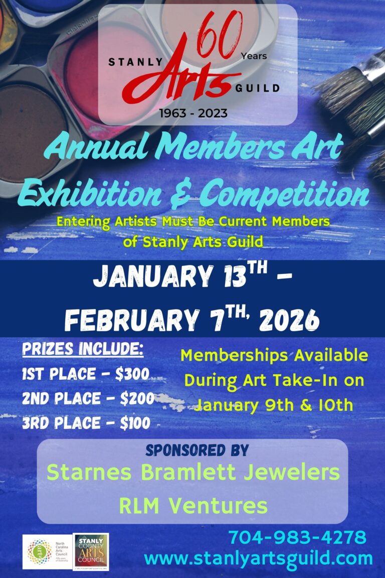 This is a chance for our members to show off their amazing artistic talents. To enter this show you must be a member of the Stanly Arts Guild. (Yes, memberships are accepted during art take-in for the show!) Awarded prizes are 1st, 2nd & 3rd place, with honorable mention ribbons being handed out at the judge’s discretion. All entries must not have previously won a ribbon in a Stanly Arts Guild show. Show information can be found by clicking the button below, and membership applications can be found under the “join” tab. Or, you can always stop by for a visit as The Guild Store and pick up a copy.